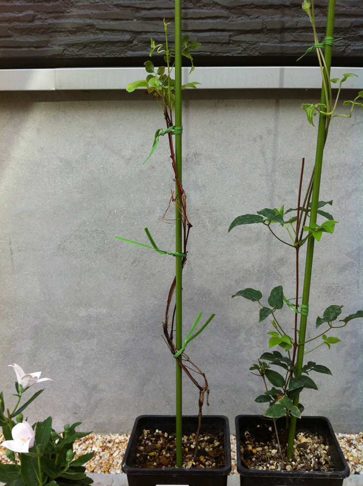 クレマチス支柱替え Posted on 2013/07/15 by 蜜 昨日到着したクレマチス。 使われていた支柱では、もう足りなくなりそうで交換した。 新枝咲きのジャックマニー系2鉢は問題なくできたのだけど、フロリダ カシスの旧枝が少し裂けてしまった。 気をつけていたつもりでもこれとは・・・( ´’A’`) たぶん、折れてはいないと思うけど(思いたい)。 フロリダ カシス 枝の表面が裂けてしまった